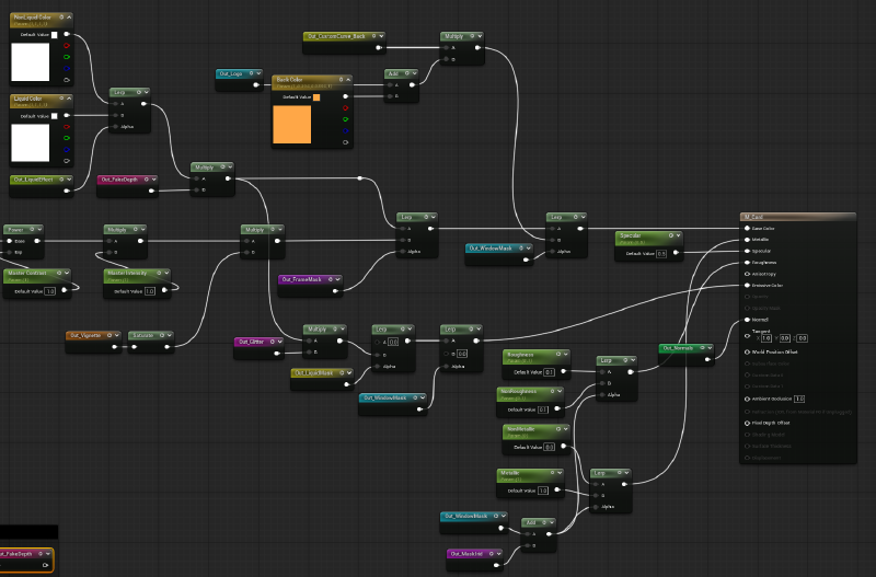 The shader above is nothing if we don’t apply it into a Blueprint logic that calculates the pendulum motion of the effect based on the rotation and velocity of the card in runtime.